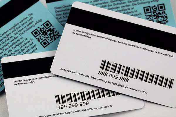 Karten mit einem Barcode oder QR-Code sind personalisiert, wobei sich die Codierung mit jeder Karte ändert. Neben dem Barcode werden keine Inhalte auf der Karte direkt gespeichert. Durch unsere Kartenlaminierung sind die Karten kratzfest und dadurch auch sicher vor Fälschung. Barcode/ QR-Code Karten bieten sich als einfachste Lösung z.B. für Ihre Kunden-, Gutschein- und Mitgliedskarten an.